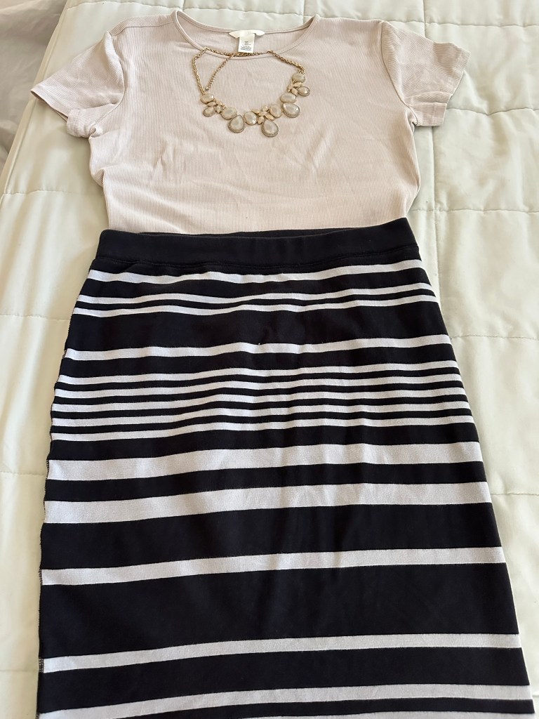My outfit today: a light beige ribbed short sleeve t-shirt from H&M, costing me $7.99. I recycled a black and grey horizontal striped pencil skirt from Old Navy that I bought years ago, maybe cost me $15.00. My newly purchased light beige sneakers from Cole Haan outlet store that costed me $50.00. I added a beige colored necklace gifted by my husband to enhance the t-shirt. I looked good and presentable. The whole outfit cost less than $80.00. In most cases $80 won’t buy you one piece of clothing.